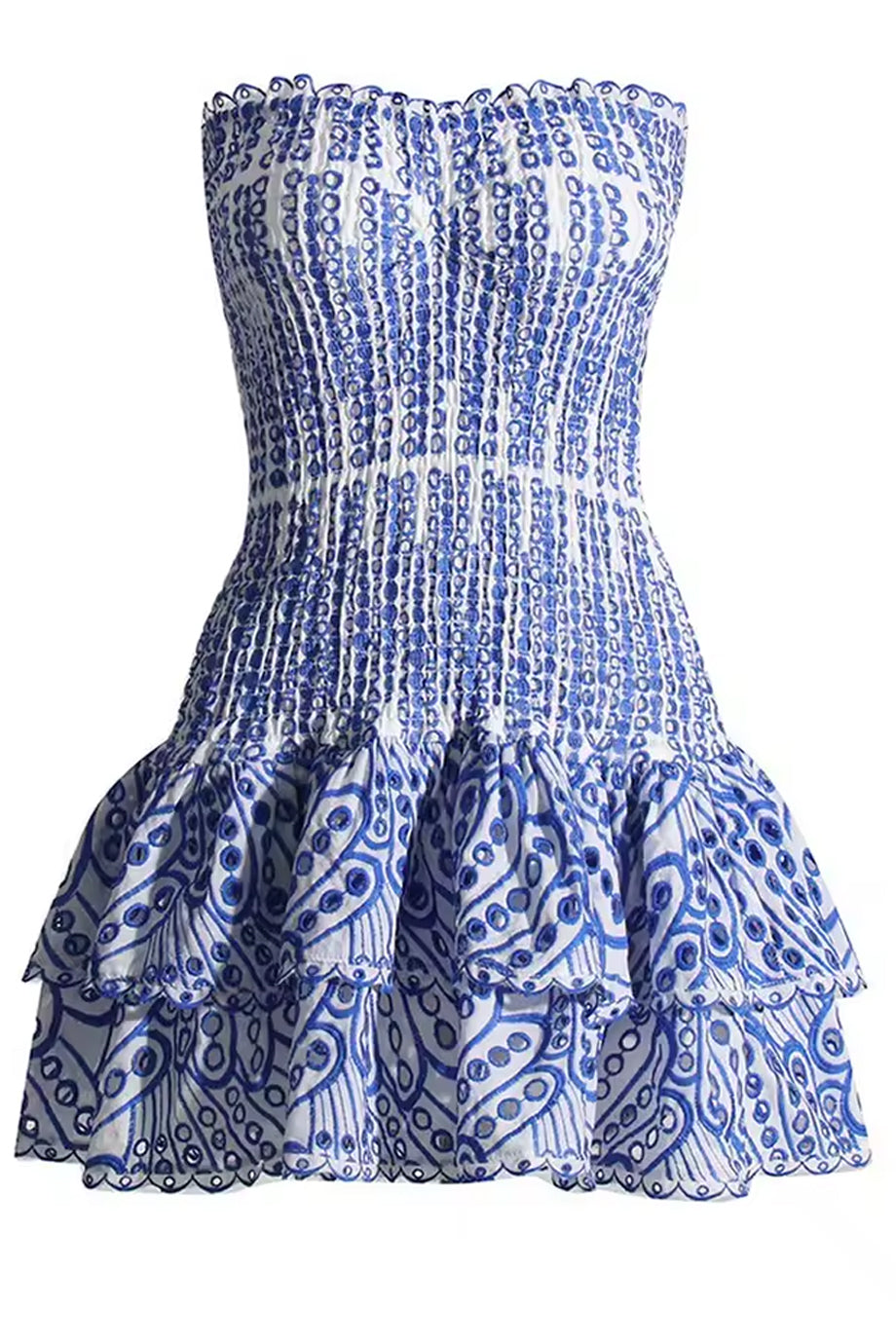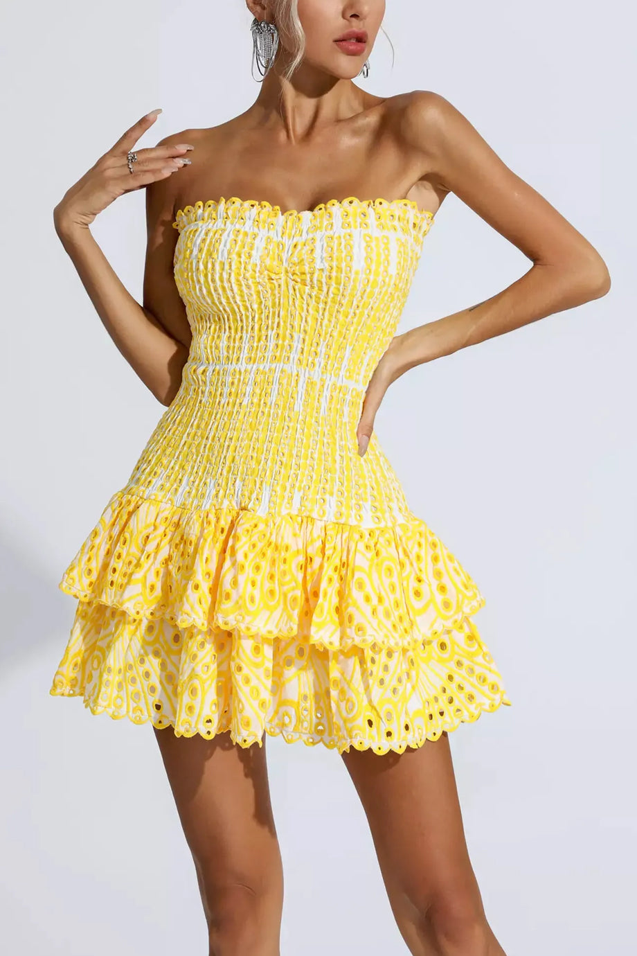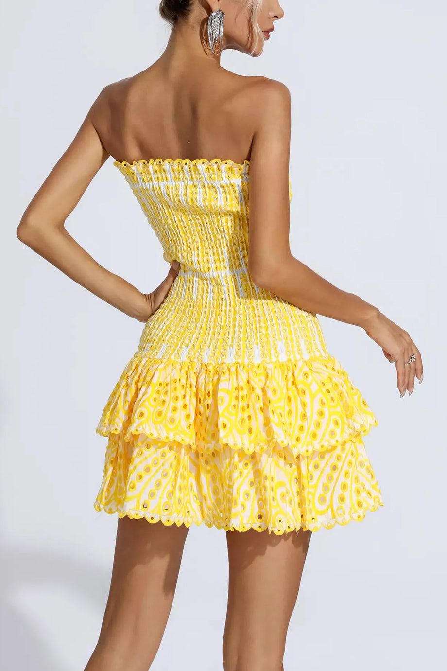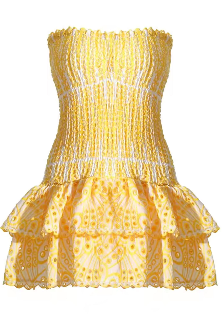 Show off your feminine side with the Anue dress. It has an elastic strapless bodice that hugs the silhouette beautifully while the bottom features impressive ruffles that offer movement and femininity. Consult the size chart below for the correct size selection.