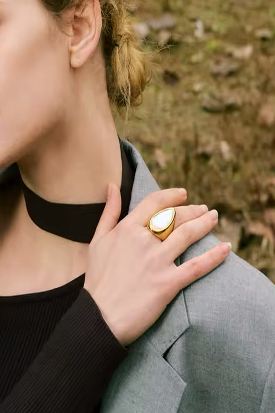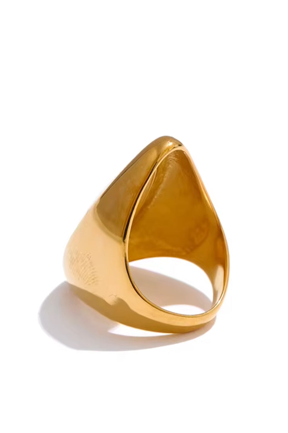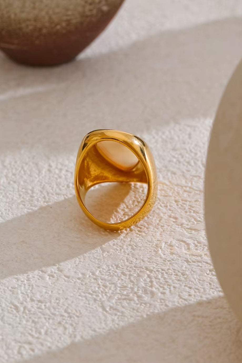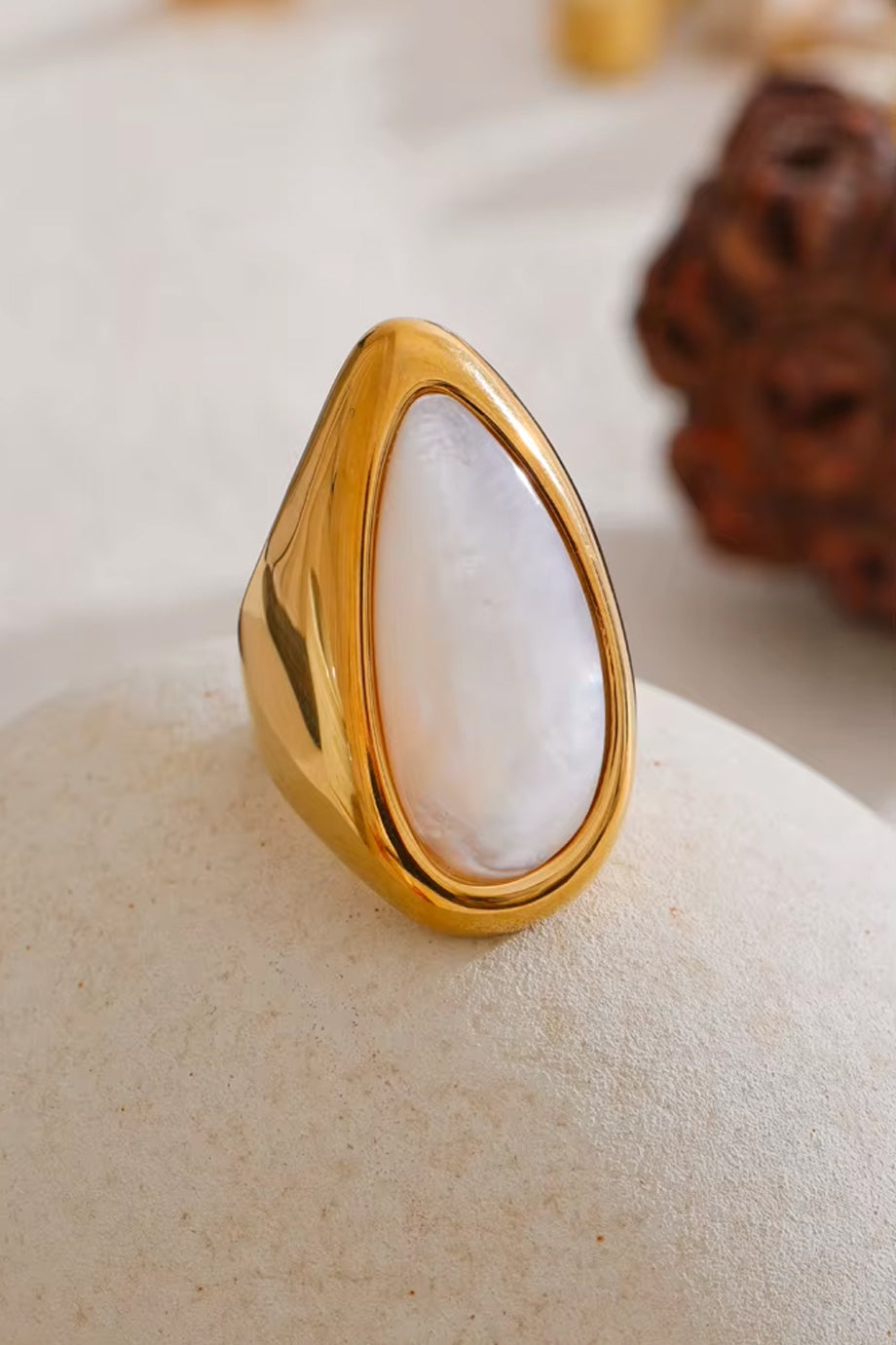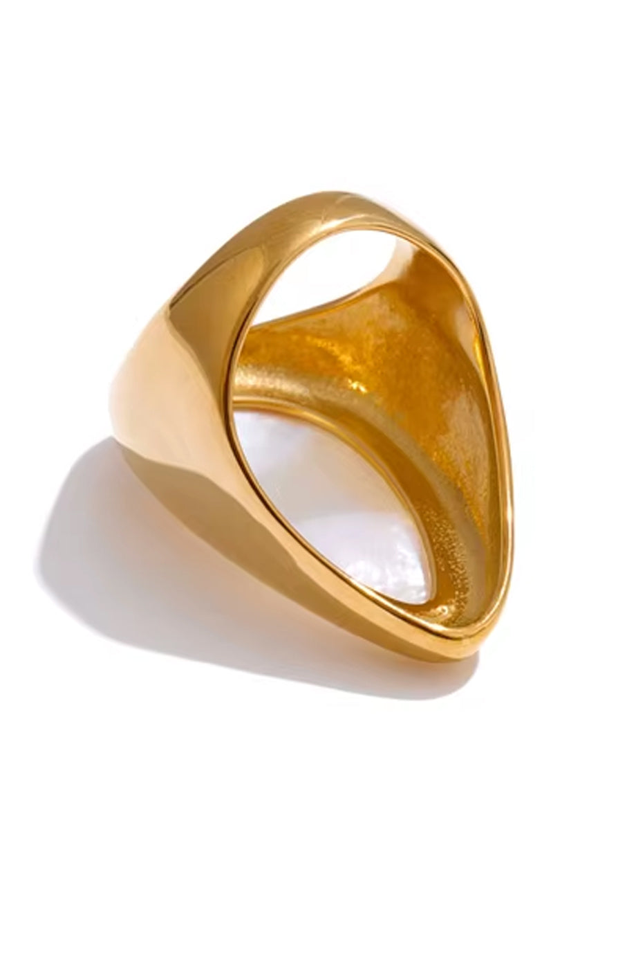 A distinctive ring in gold color. The Azra ring is gold-plated, with three layers of gold plating. It features an impressive pearl with an asymmetrical shape that elegantly hugs the finger. It is made of steel. One Size (7.5)