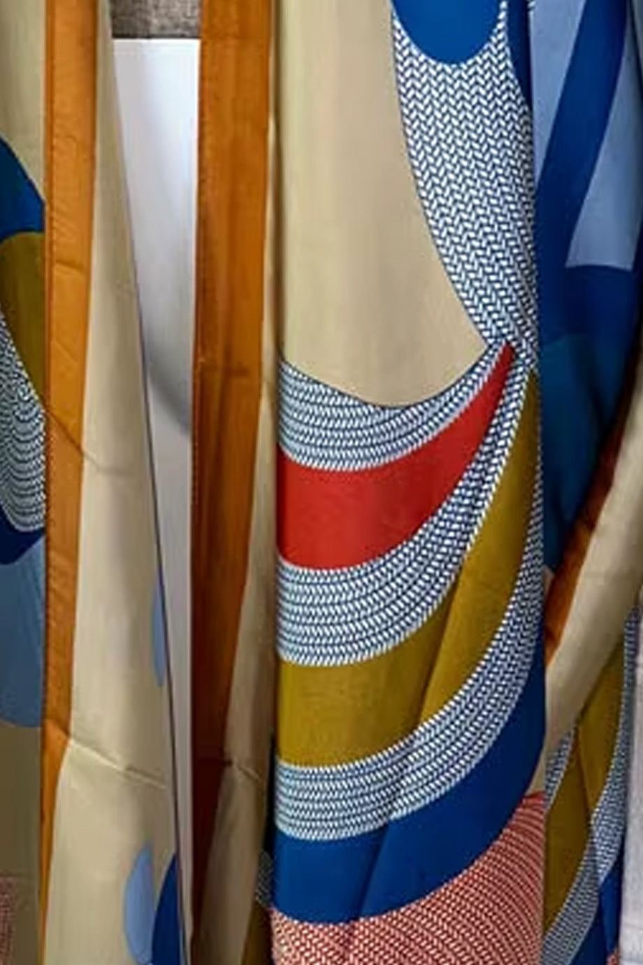 Wrap yourself in wearable art with the Kaleido Kimono. This statement piece features a bold and harmonious fusion of geometric patterns in vivid hues of blue, red, gold, and cream, bordered with a rich ochre trim. Made from a silky, flowing fabric, it drapes beautifully on any silhouette, offering both elegance and comfort. Ideal as a luxe layering piece - whether over swimwear, evening wear, or as an artistic loungewear statement. One Size.