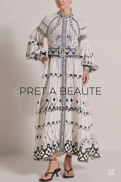 A true statement of refined artistry, the Alhambra dress is elegance at its most architectural. With intricate black embroidery on a soft ecru base, sculptural sleeves, and fabric-covered buttons down the front, this maxi silhouette evokes a regal, almost timeless essence. The wide embroidered belt cinches the waist to perfection, offering a balanced contrast to the voluminous balloon sleeves.