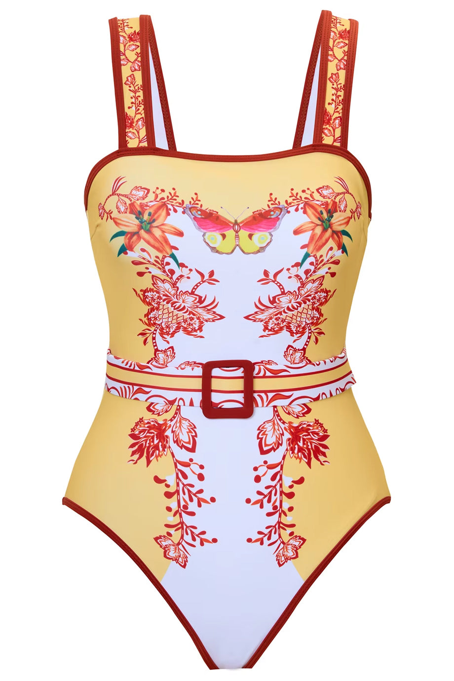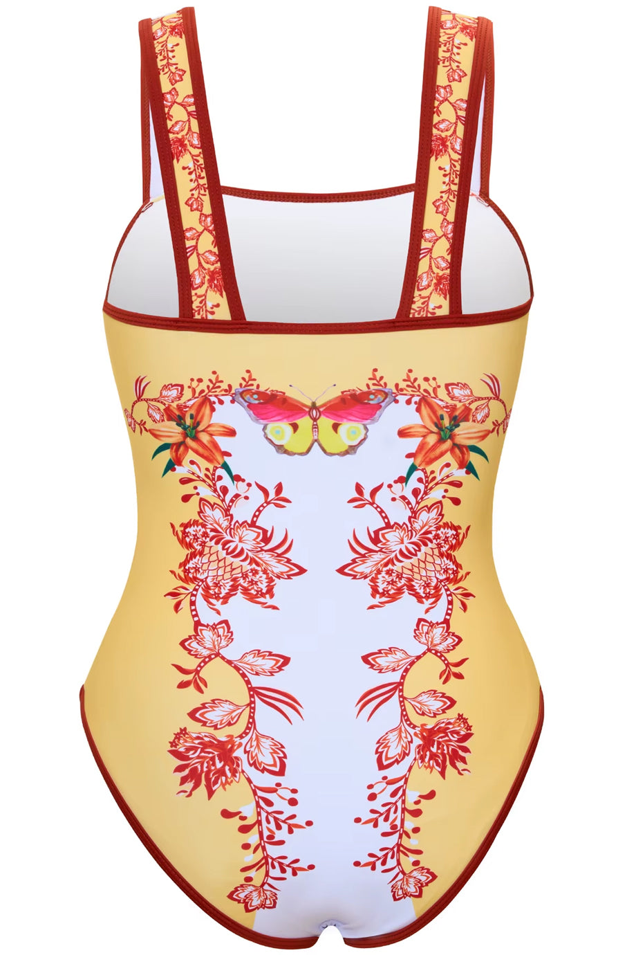 Set with one-piece swimsuit and pareo. The Enchanted swimsuit has a square bodice, wide straps and is decorated with a floral print in red, yellow and orange. The pareo has a light texture and complements the set. Consult the size chart below for the correct size selection.