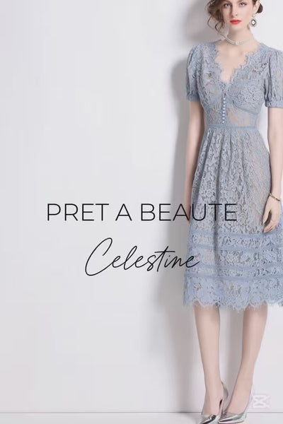 The Celestine dress captures the understated elegance of lace. Crafted in a soft powder blue, it features a fitted bodice with button details and gently flares into a flowing midi skirt. The V-neckline at the front and back enhances its refined silhouette, offering a balance of delicacy and sophistication.