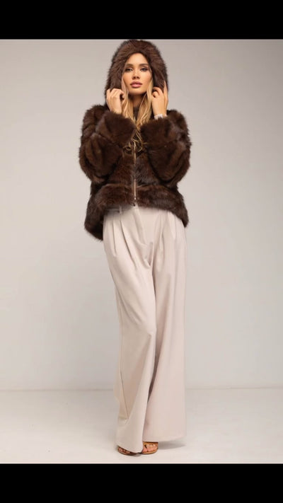 The Ardelle jacket exudes subtle luxury and modern femininity. It stands out for its plush faux fur texture, soft hood, and sleek zip fastening that ensures a perfect fit. It features side pockets and a slightly cropped cut for a balanced silhouette.