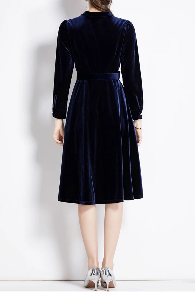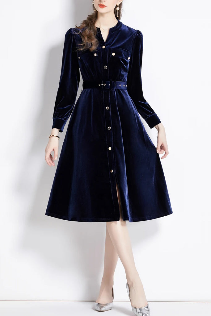 L'abito Lesety di Diane Ford sarà lo stile che sceglierai ancora e ancora per feste e occasioni speciali. Realizzato in velluto blu, l'abito ha maniche lunghe ed è decorato con bottoni dorati ispirati allo stile vintage. Tacchi e un rossetto brillante sono le uniche aggiunte necessarie per completare il look.