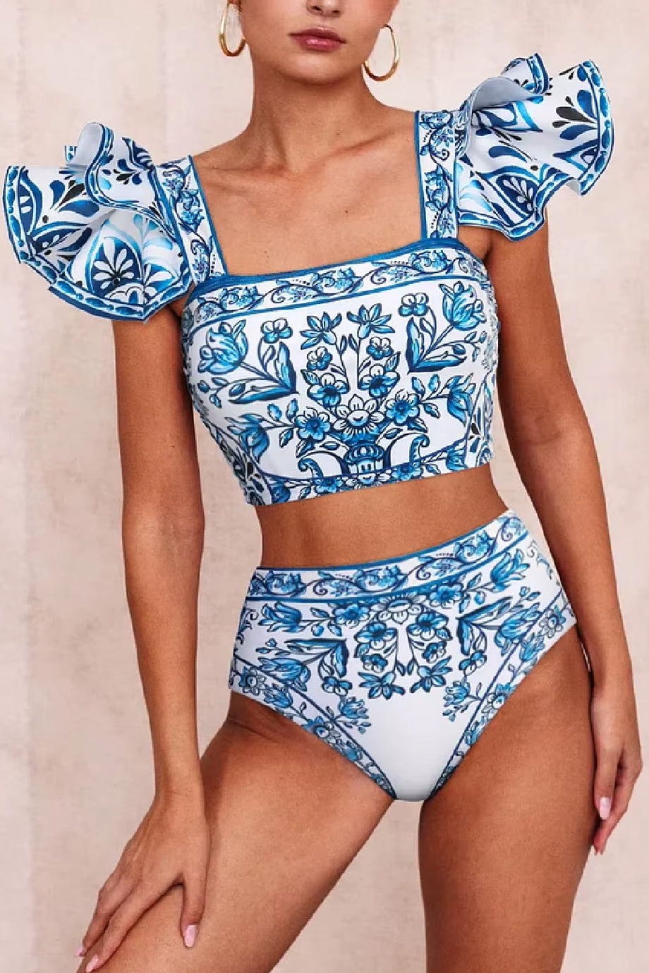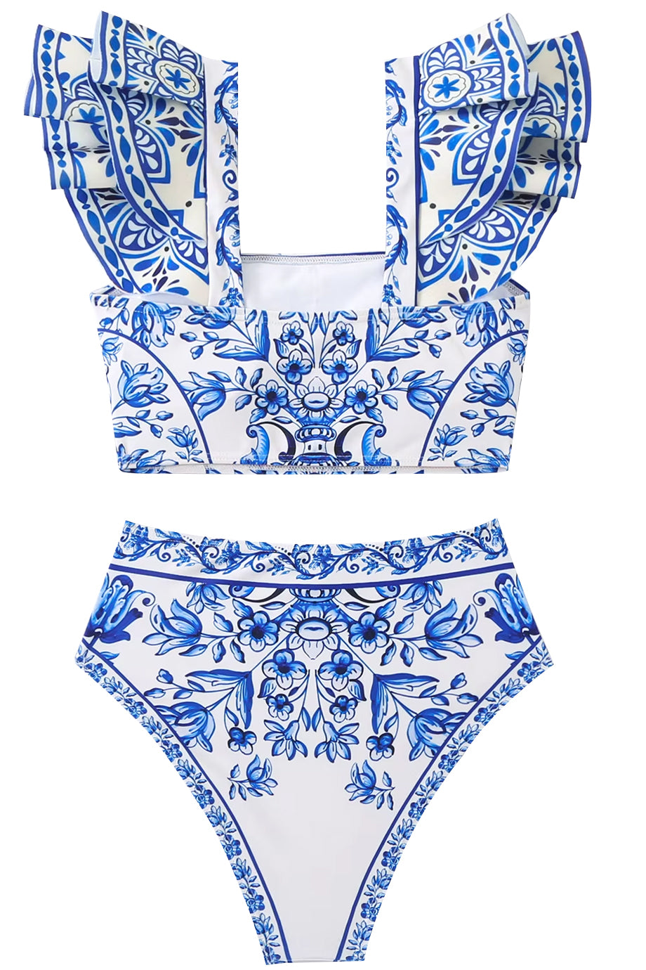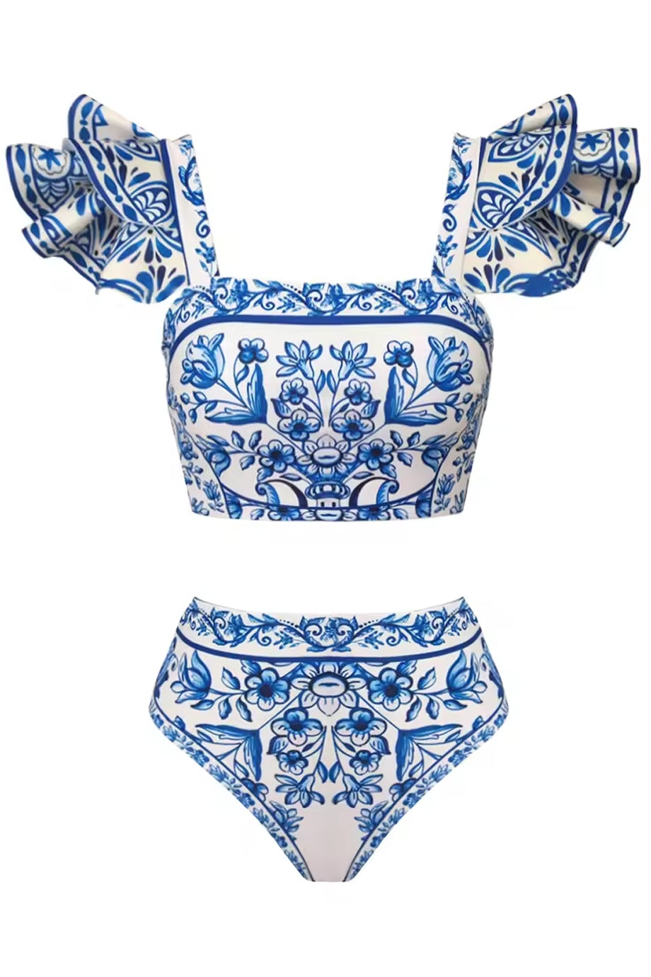 The Lumière swimsuit is decorated with elaborate cutouts that create floral patterns, has a square bodice, straps decorated with ruffles and a high-waisted bottom. Please consult the size chart below for the correct size selection.