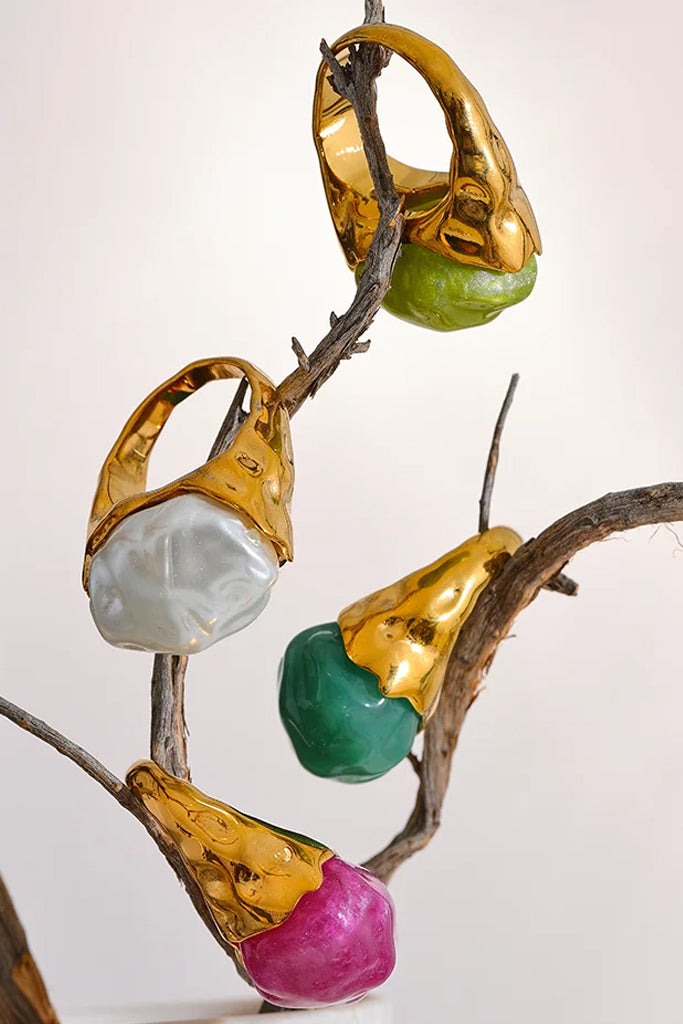 Cara Emerson's pieces are meticulously handmade, giving them an heirloom quality. Crafted from gold plated stainless steel, the 'Fluffy' ring is decorated with a bold resin stone. Wear yours on your index finger for the biggest impact. Size 8 (56).