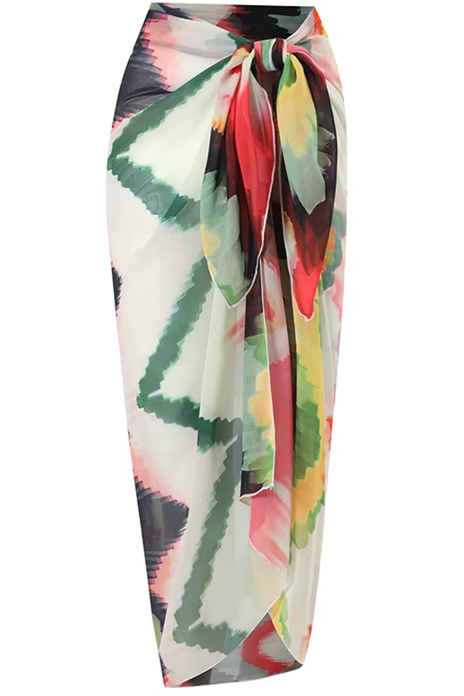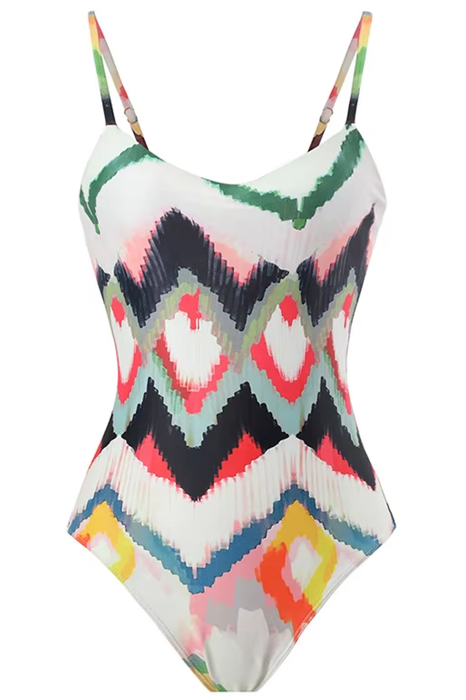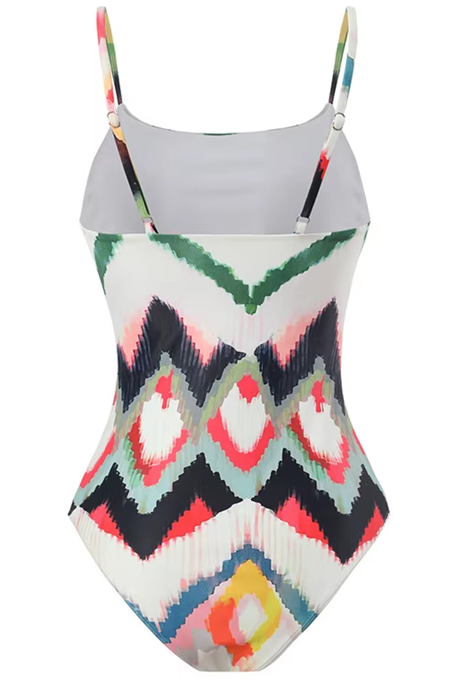One-piece swimsuit and pareo set. The Ondine swimsuit features an impressive bodice and is decorated with distinctive geometric designs in various colors. Please refer to the size chart below for the correct size selection.