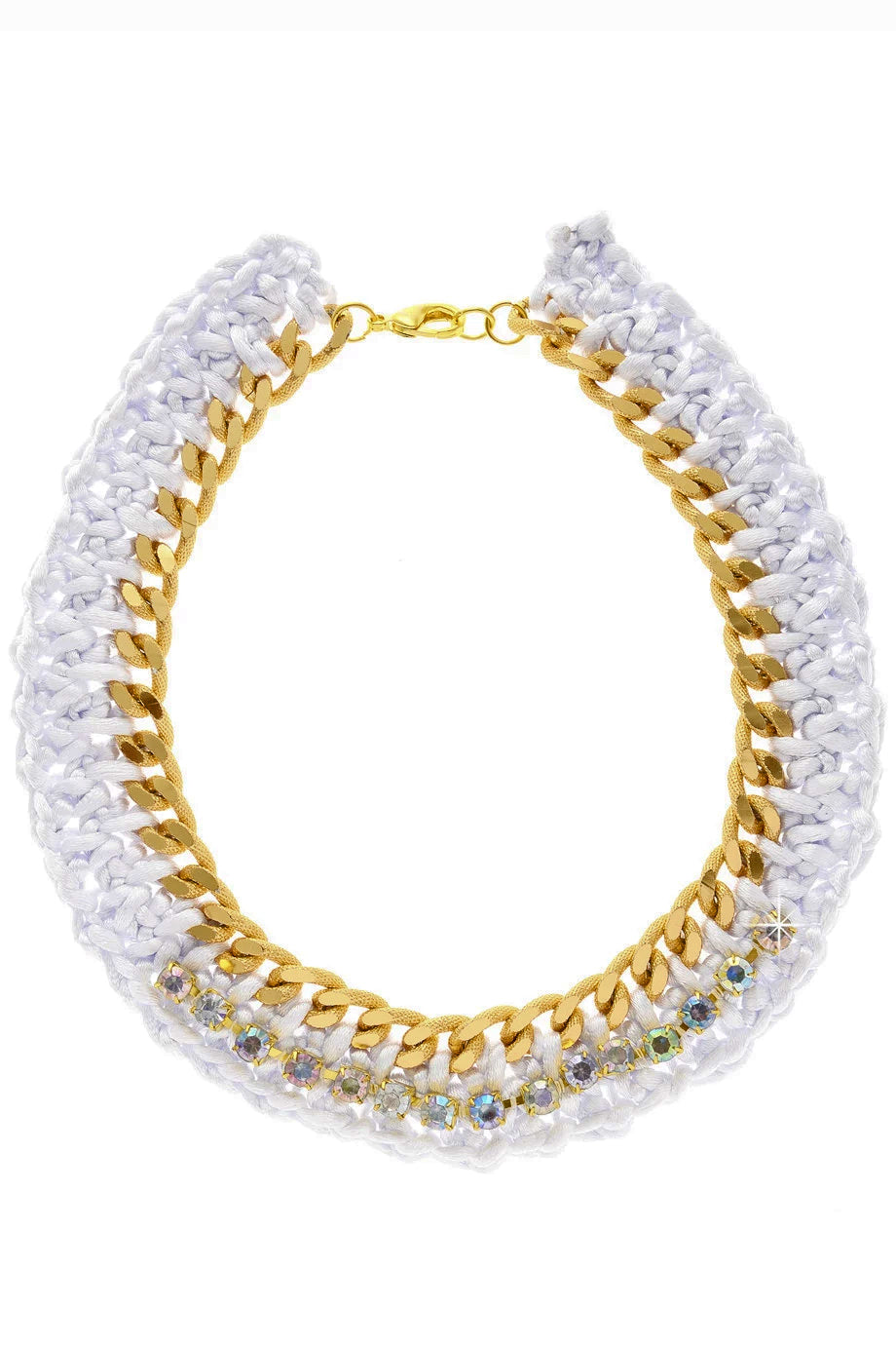 Impressive handmade necklace by Alberto Galleti. The ANNELIESE necklace consists of white silk cord, woven into a gold-colored chain decorated with a series of clear crystals. The necklace fits with a lobster clasp and has a fixed length.