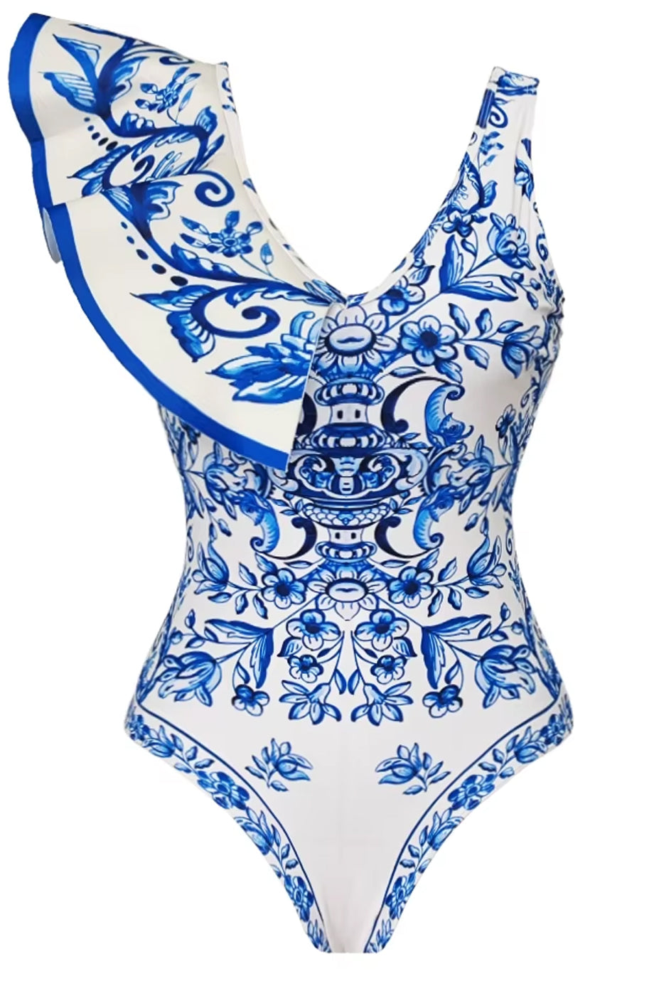 The Elegant Waves swimsuit has an impressive design with a V-neck and wide straps. One shoulder is decorated with a ruffle. It is printed with geometric flowers and patterns. Consult the size chart below for the correct size selection.