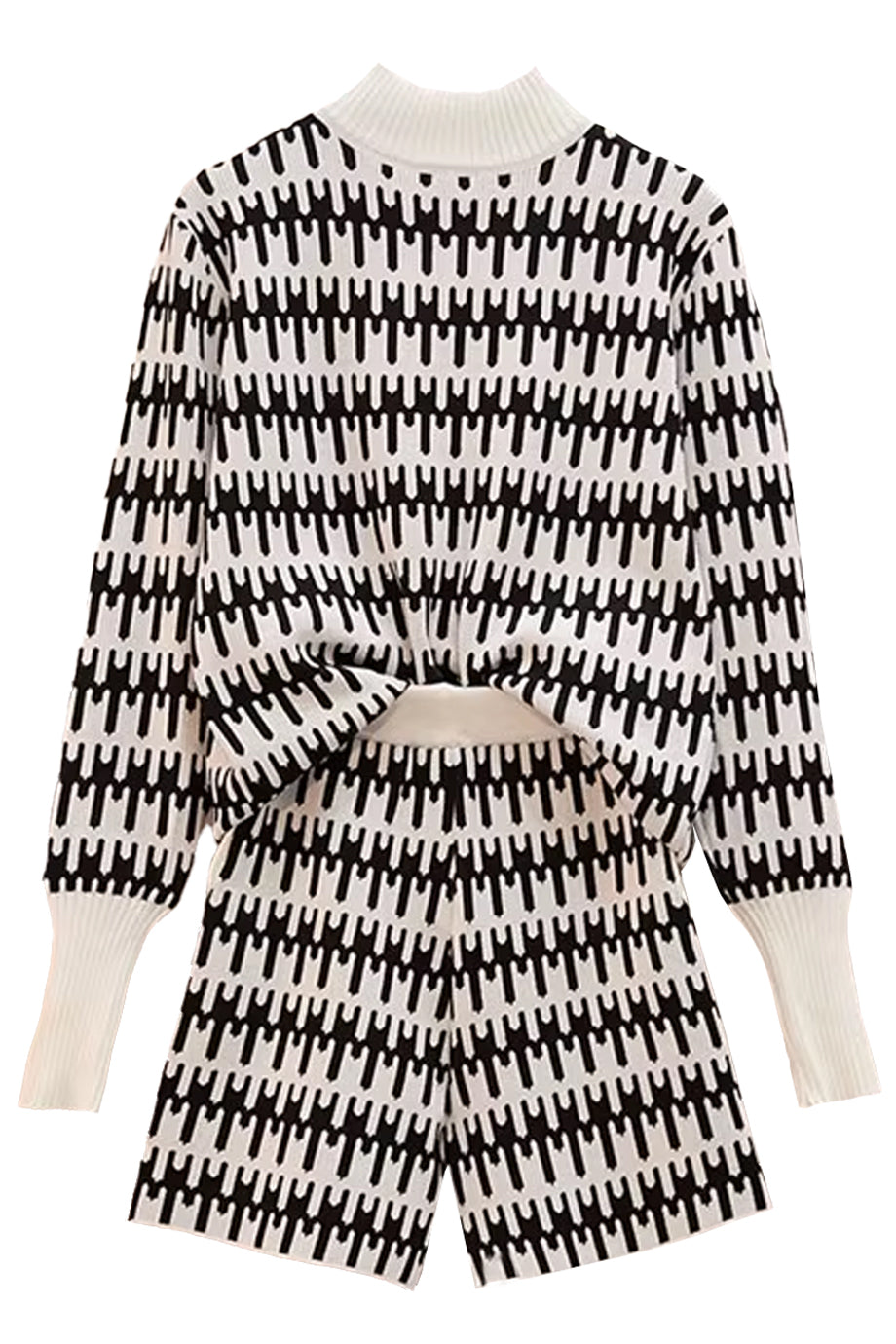 Set in tones of white and black from Moncye. The Manimy set has a geometric design and consists of a pullover and knitted shorts. The sweater in the set has a turtleneck, long sleeves and a relaxed fit. The shorts are knitted and fit with elastic. EU SIZE.