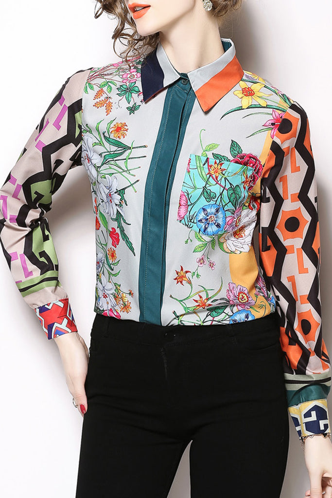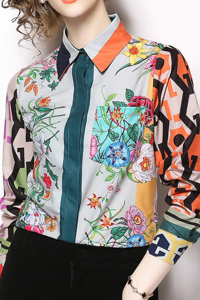 The Floral Park shirt features a striking floral pattern alternating with minimal prints on the sleeves. It has long sleeves and a button-down fit. Please refer to the size chart below for the correct size selection.