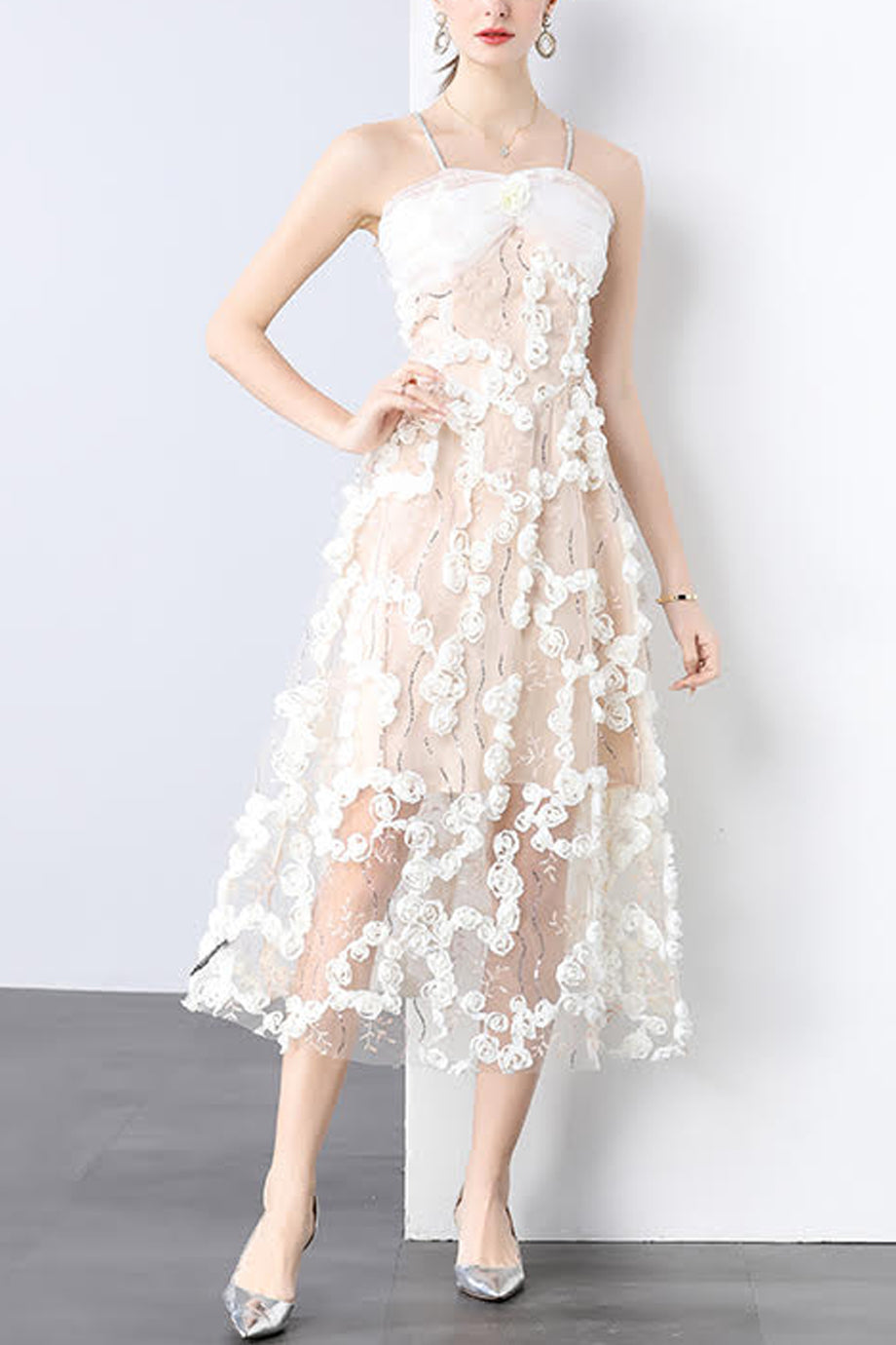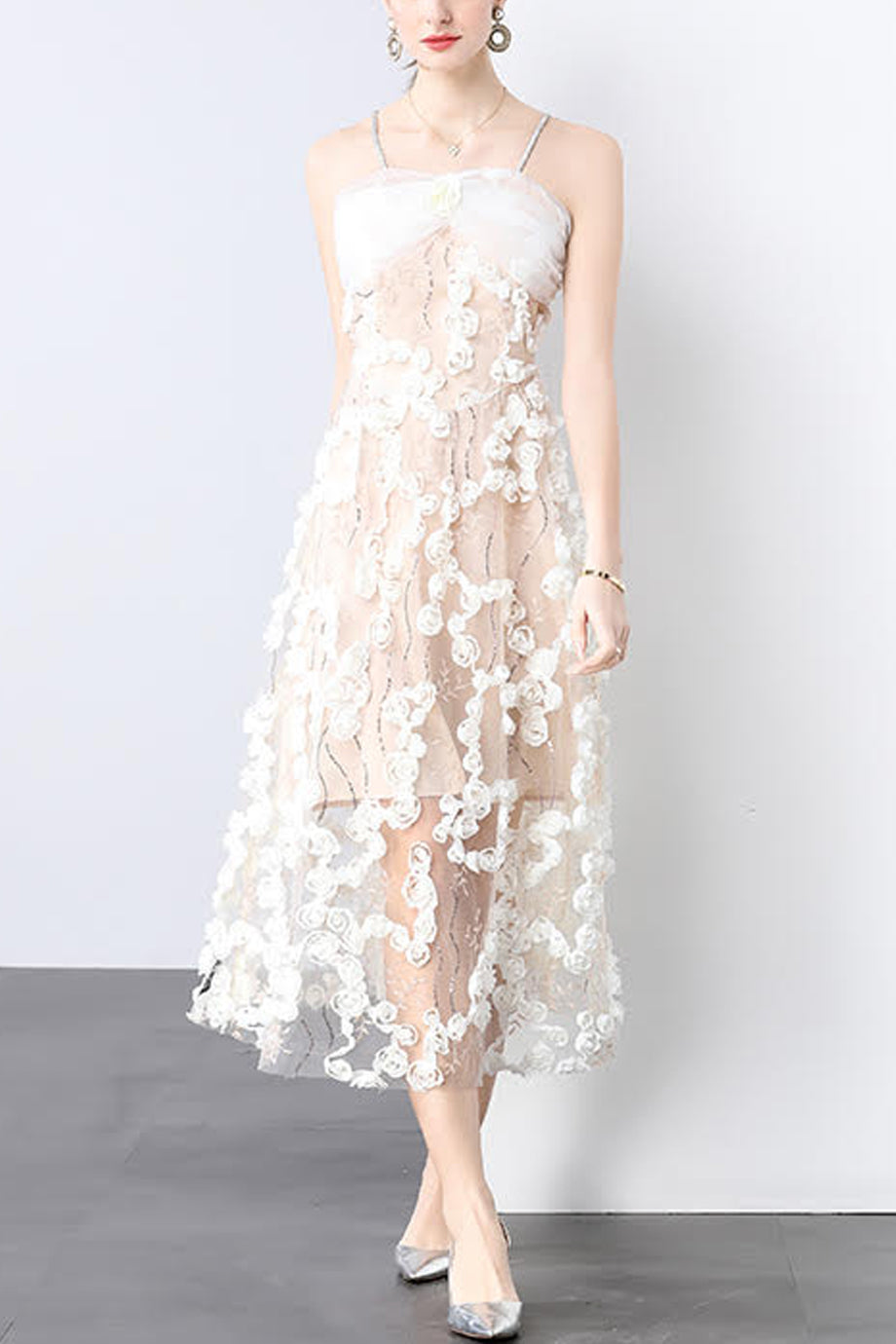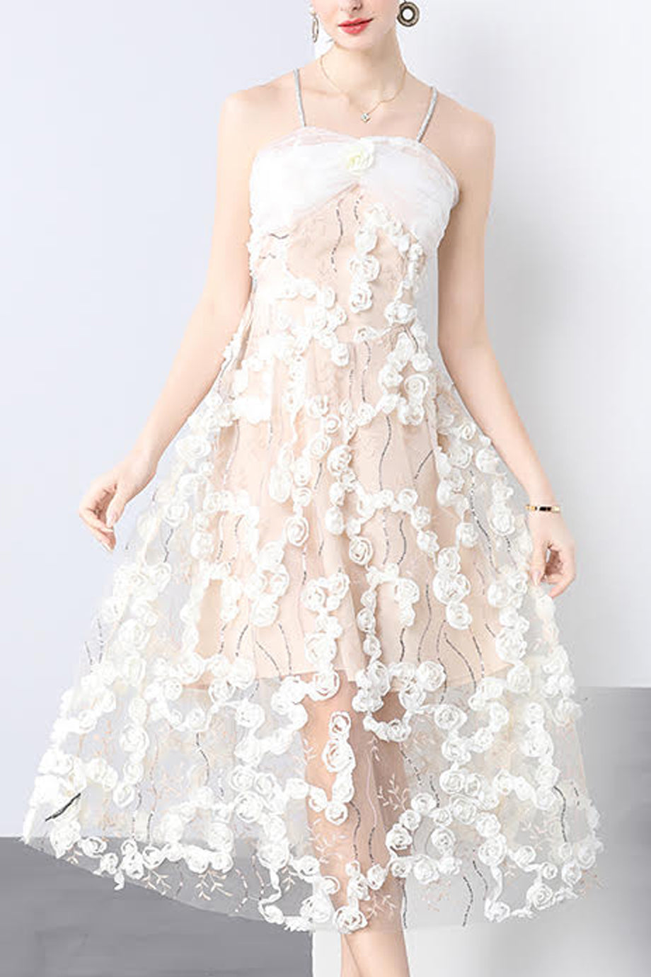 Choose the Mist dress for a romantic look that will turn heads. Embellished with ornate white flower buds, the Mist dress has thin straps. Perfect for receptions and christenings.