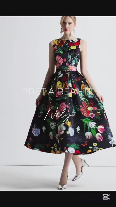 The Nely dress features a striking floral print, a smile neckline and is sleeveless. The bottom has an open A-line. The dress is fitted with a zipper. Please refer to the size chart below for the correct size selection.