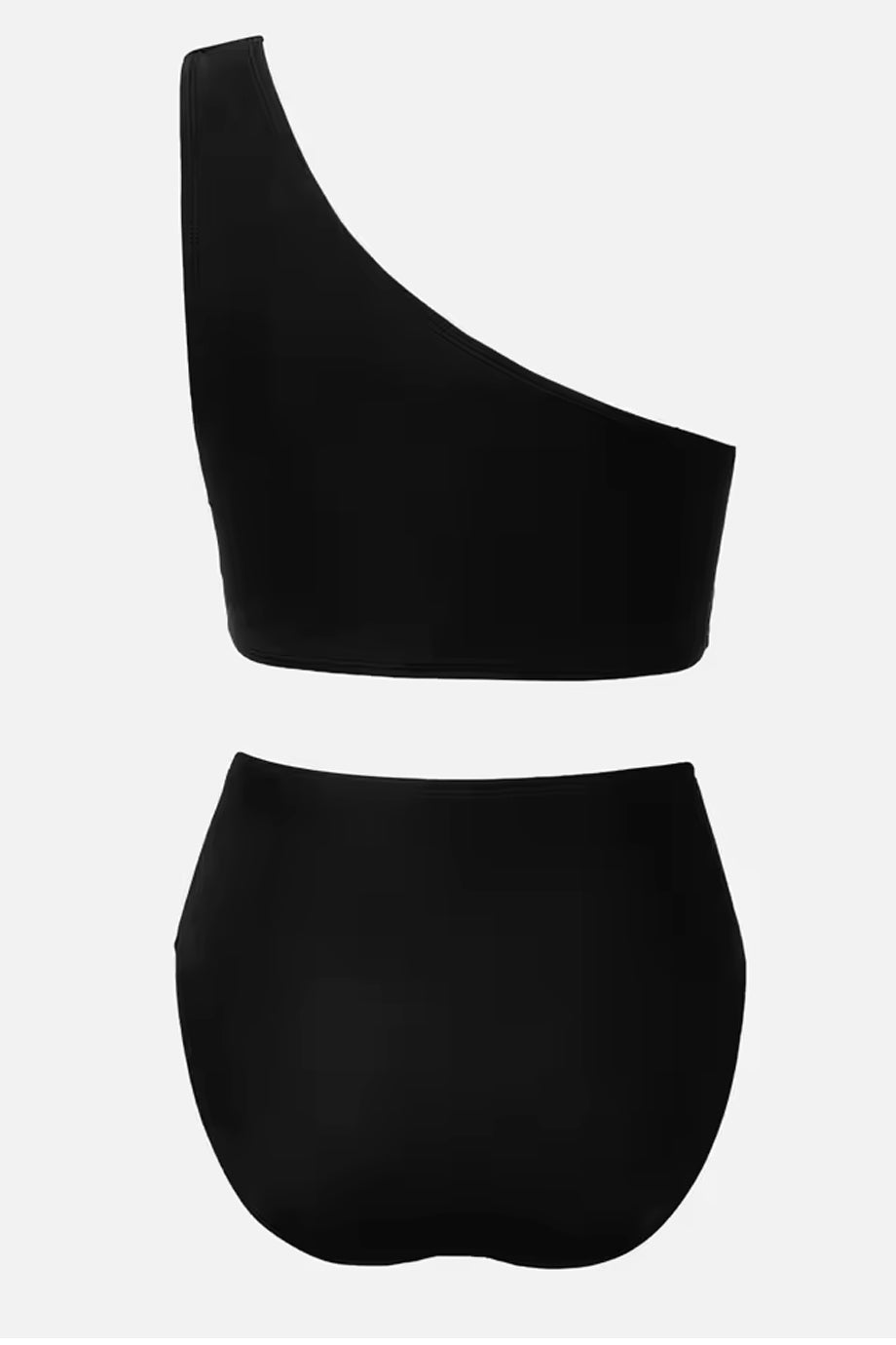 Sculpted lines, confident asymmetry, and a bold contrast between black and white—Ecliptica draws the eye with effortless sophistication. The one-shoulder design is enhanced by a padded bra for subtle support and shape, while the high-waisted bottom flatters with ease and elegance.