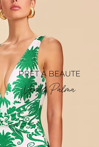 Αναδείξτε το καλοκαιρινό σας στυλ με το σετ Verde Palma — έναν κομψό συνδυασμό βοτανικού μοτίβου σε ζωντανό πράσινο πάνω σε ανοικτό φόντο. Το ολόσωμο μαγιό διαθέτει εντυπωσιακό V ντεκολτέ και twist λεπτομέρεια που αγκαλιάζει το σώμα, ενώ το ασορτί παντελόνι με φαρδύ τελείωμα προσθέτει ροή και άνεση στην εμφάνιση.