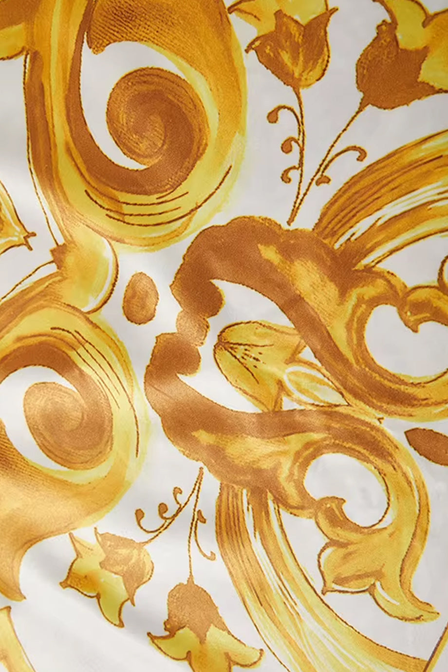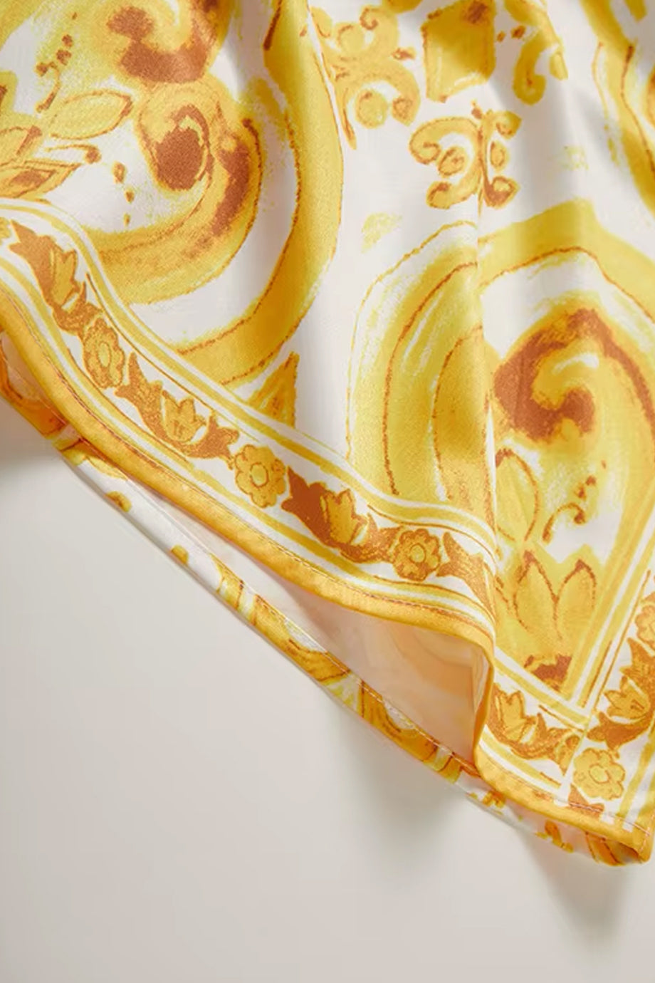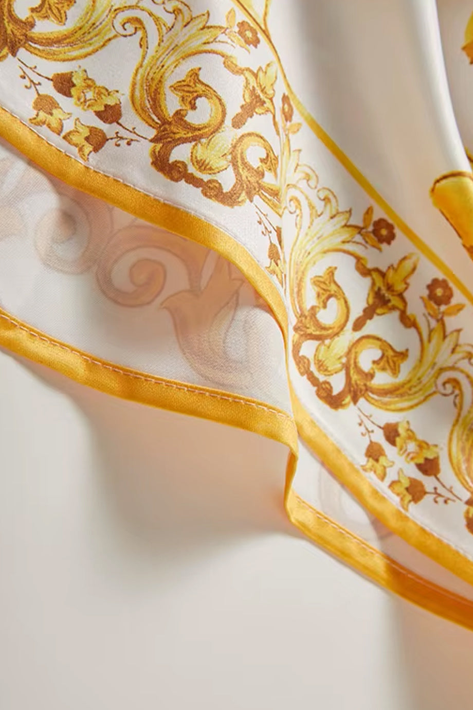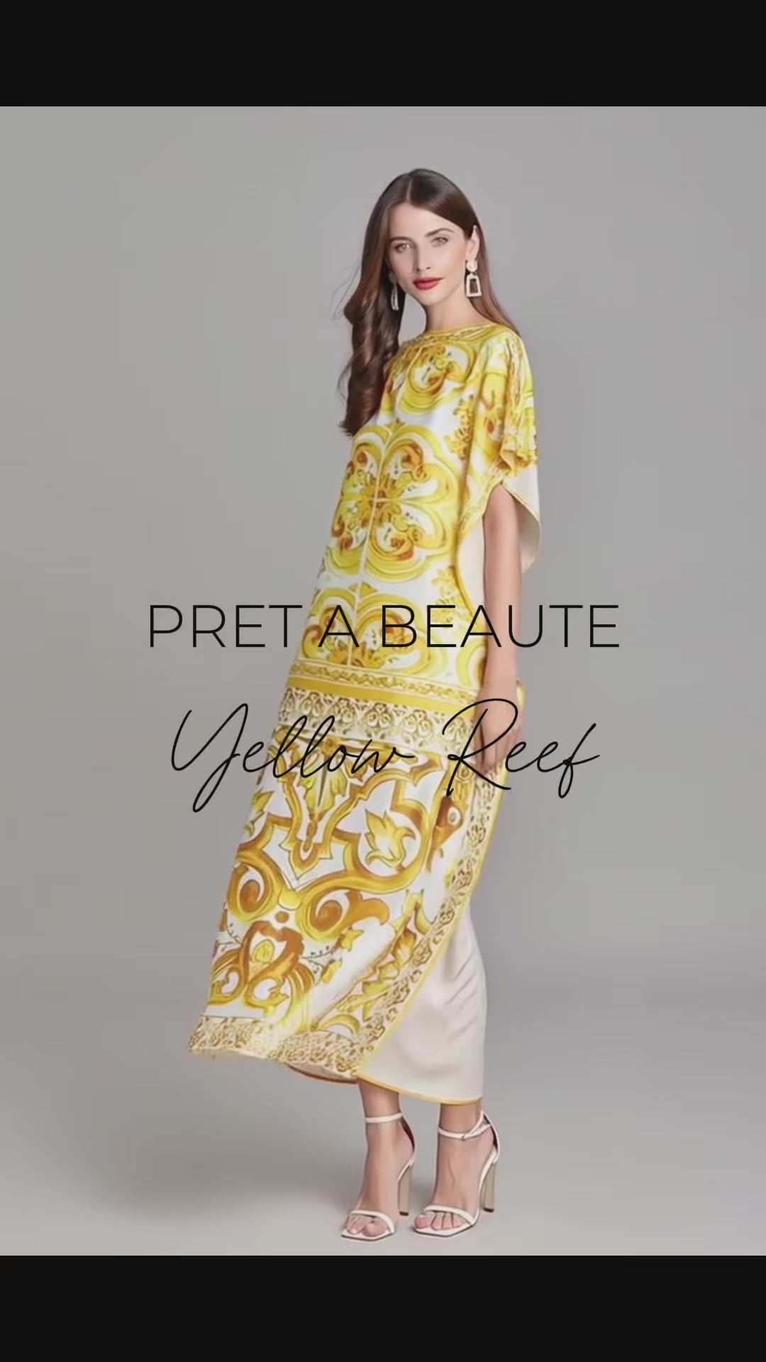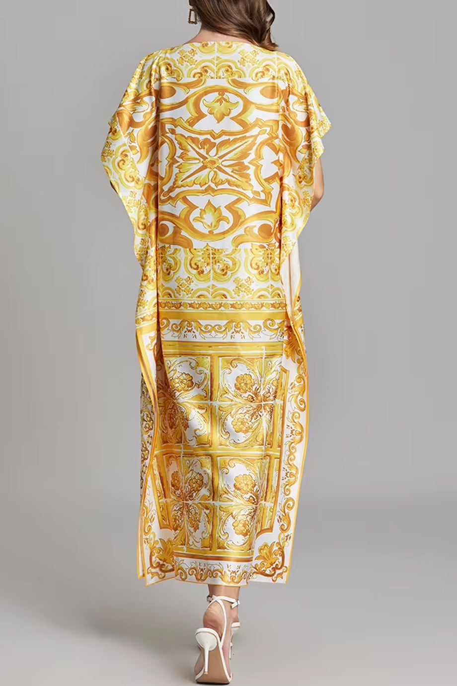 A unique, flowing kaftan dress from Philip Lang. The Yellow Reef dress features an elegant pattern in shades of gold and white. It has a loose, airy silhouette and short sleeves. Please refer to the size chart below for correct size selection.